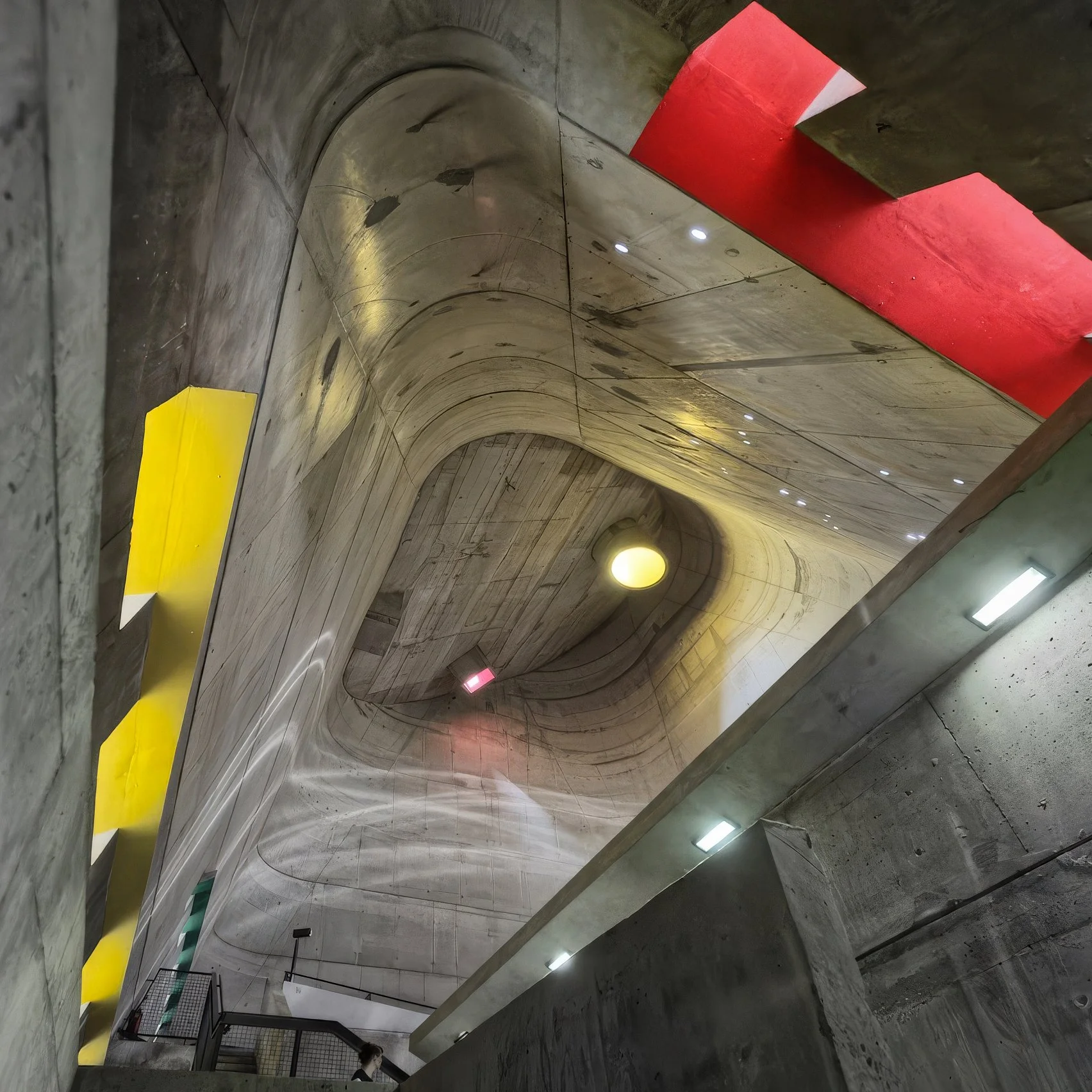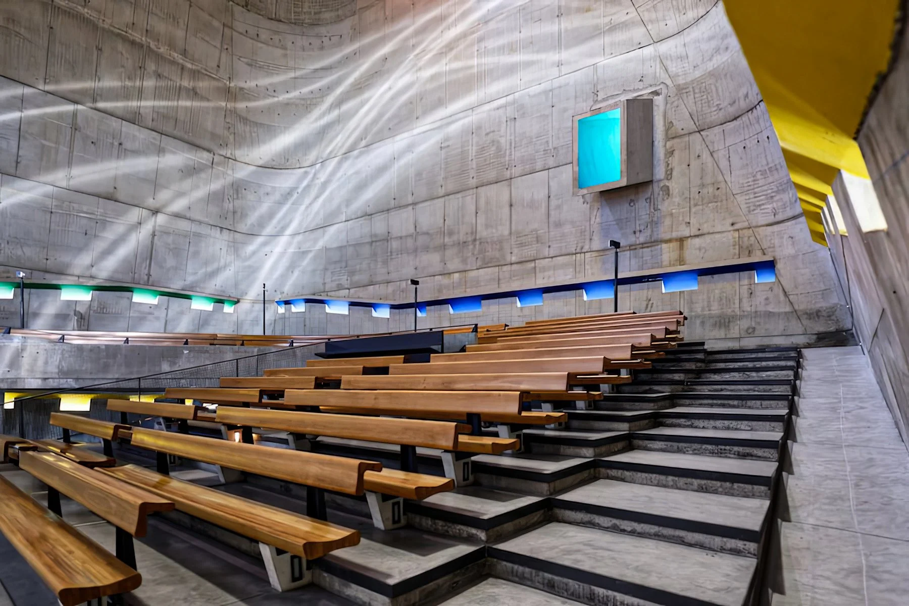 The finished church rises as a truncated cone, four trapezoidal walls soaring 33 meters from a square base. Its sharp edges at ground level dissolve into rounded lines as it ascends, a play of weight and grace. The shell required extraordinary effort, with more than a hundred custom formworks created for the concrete curves. Water path were woven into the design itself: gutters cut across façades in geometric grids.