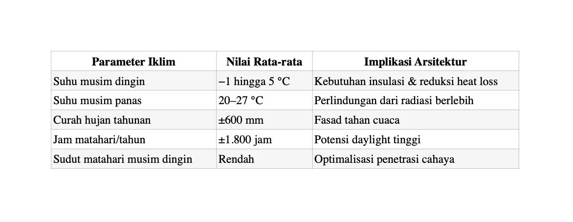 Bangunan publik seperti Koïfhus dan gereja memiliki: Dinding batu tebal (>60 cm) → high thermal inertia. Jendela tinggi dan sempit → pencahayaan vertikal terkontrol. Volume ruang besar → stratifikasi termal alami.