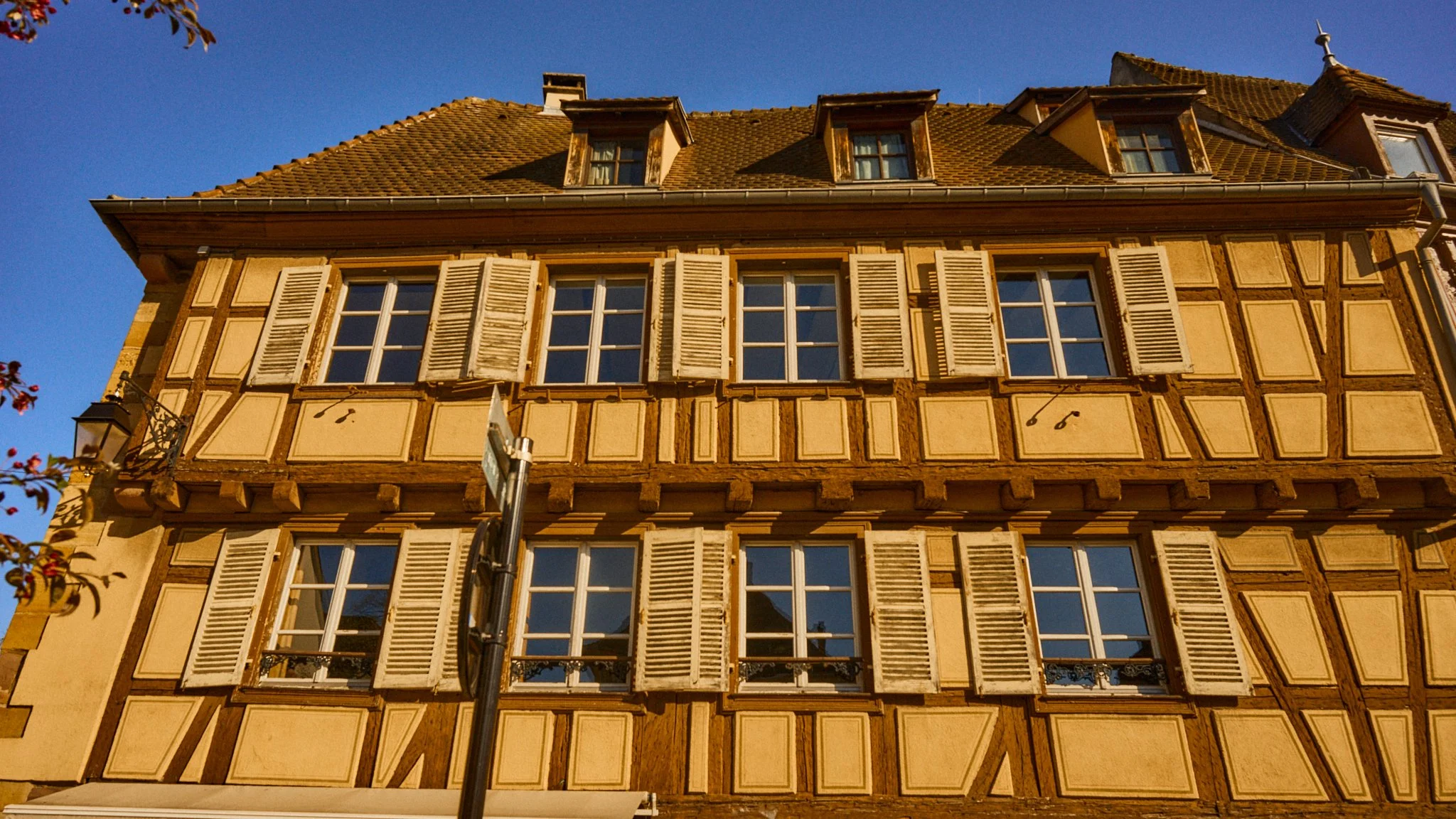 Bangunan hunian tradisional Colmar menggunakan rangka kayu dengan isian mineral. Karakteristik utamanya: Massa termal sedang, memungkinkan thermal lag beberapa jam. Bukaan kecil dan terkontrol, meminimalkan kehilangan panas musim dingin. Overhang lantai atas (jettying) berfungsi sebagai perangkat self-shading.