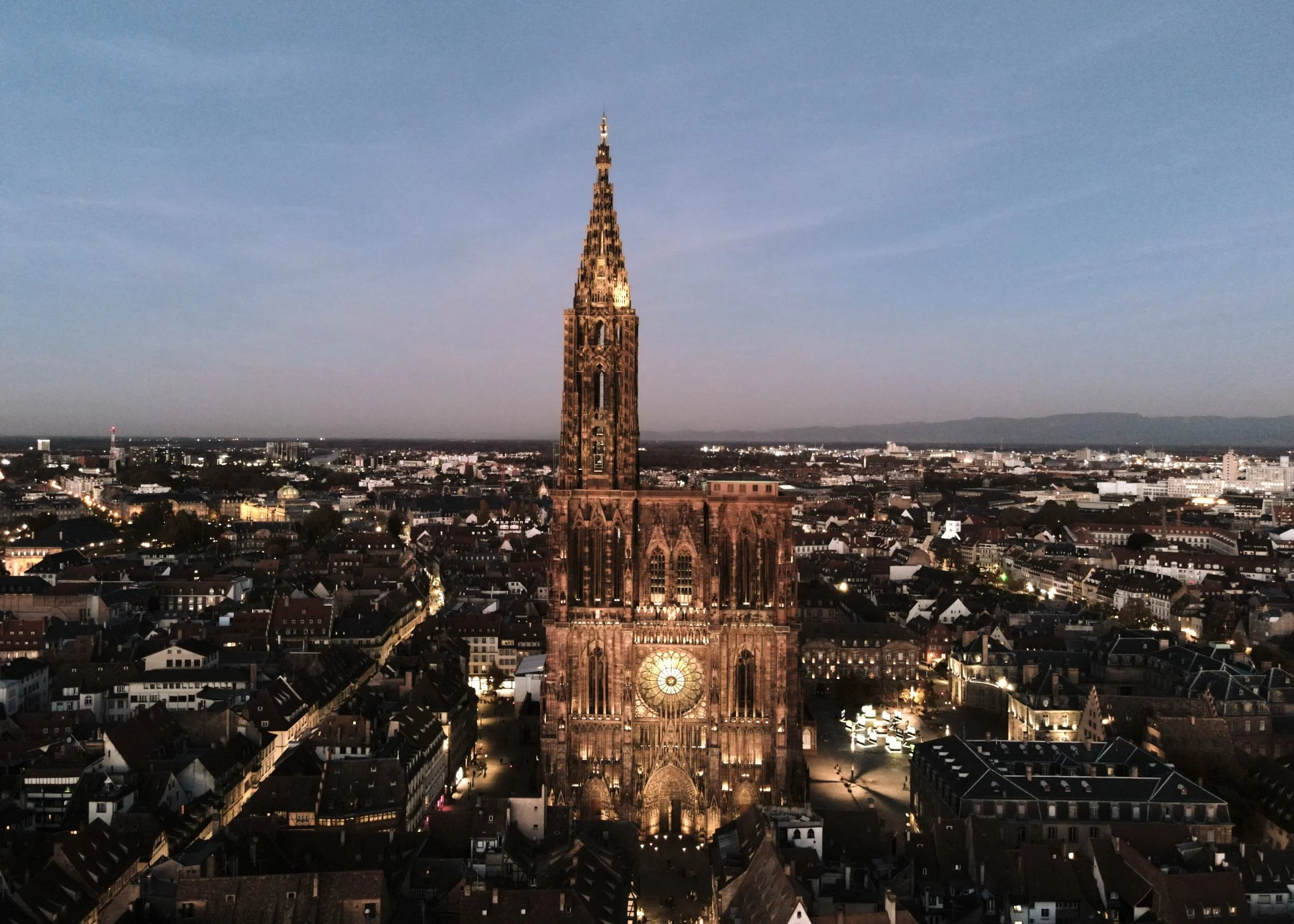 Lighting buatan di katedral ini dirancang dengan prinsip minimum intervention. Penggunaan warm color temperature digunakan menegaskan tekstur dan warna batu pasir Vosges yang kemerahan. Pencahayaan aksen menyoroti struktur vertikal, kolom, dan vault tanpa merusak suasana kontemplatif. Pada malam hari, iluminasi eksterior menara berfungsi sebagai penanda kota (urban landmark), menjadikan katedral poros visual Strasbourg.