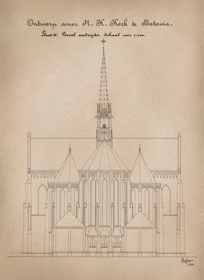 Gambar Tampak Arsitektur Katedral Jakarta 1890 menghadap selatan - ditanda tangani oleh Dijkmans, SJ